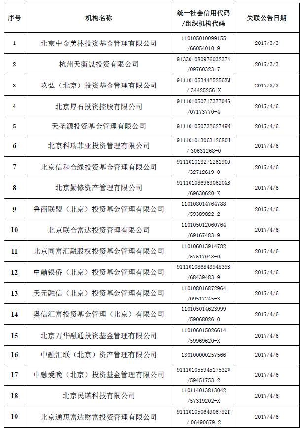 自实施私募基金管理人失联公示制度以来,协会共对外公告15批失联机构和两批公示期满三个月且仍未主动联系协会的失联机构,依公告注销42家失联机构私募基金管理人登记。现有北京中金美林投资基金管理有限公司等50家机构符合公示期满三个月且未主动联系协会并提供有效证明材料的注销条件。协会将注销该50家机构私募基金管理人登记,并将上述情形计入资本市场诚信档案数据库。社会公众可通过证券期货市场失信记录查询平台(http://shixin.csrc.gov.cn/honestypub/)进行查询。