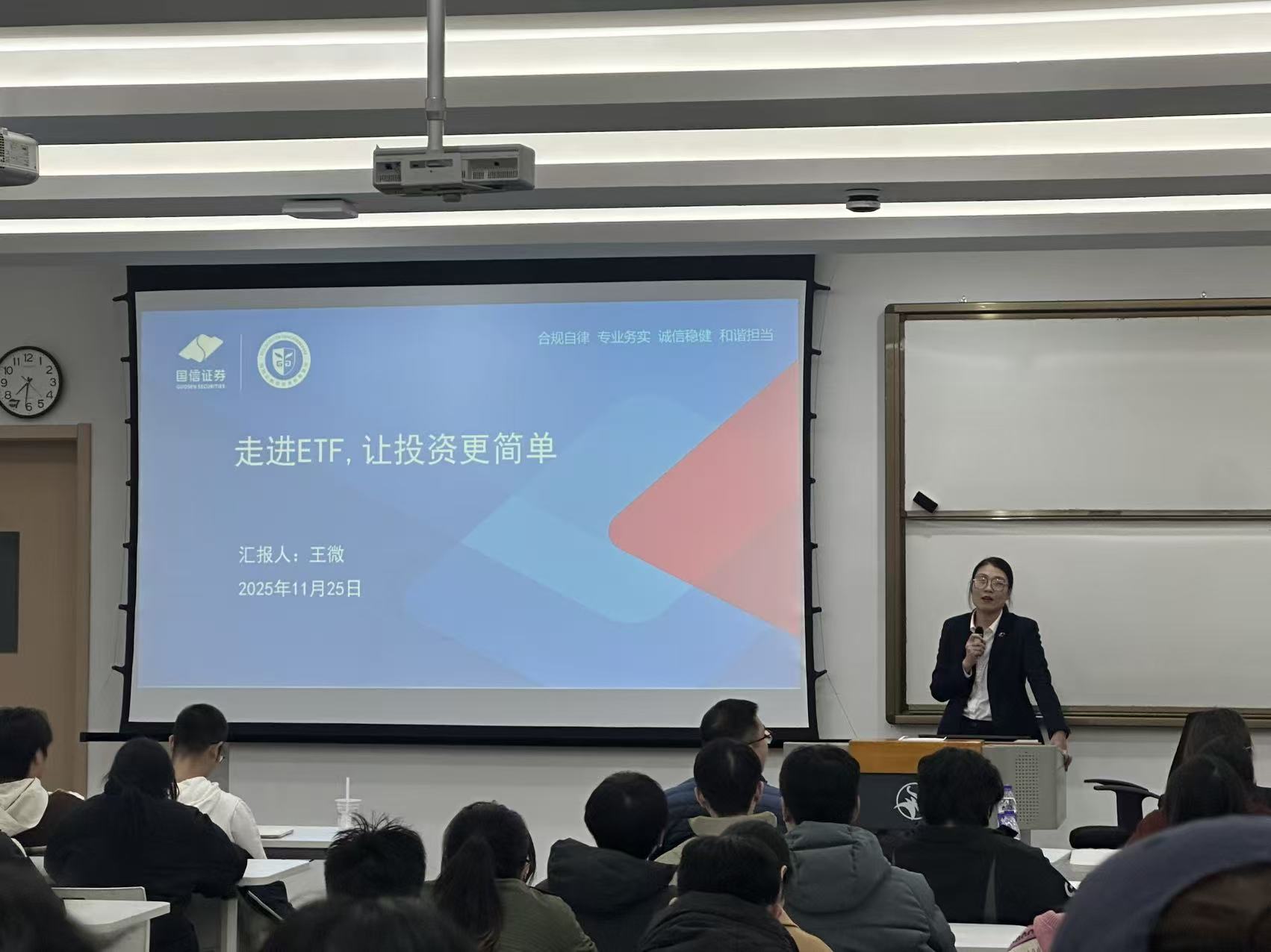 为加强高校应用型人才的培养,助力在校大学生及时了解资本市场行情动态,引导学生树立正确的投资观,11月26日晚,由宁波市证券期货业协会与浙江万里学院合作举办的第37期在甬高校证券期货人才特色班课程在浙江万里学院商学院顺利举行。课程邀请了兴业期货投资咨询部研究员刘启跃、国信证券宁波分公司投资顾问王微两位讲师为学生讲授《套期保值实操流程及案例分享》、《证券投资基金实务-ETF基础知识》课程。120余名金融相关专业在校生参加课程学习。