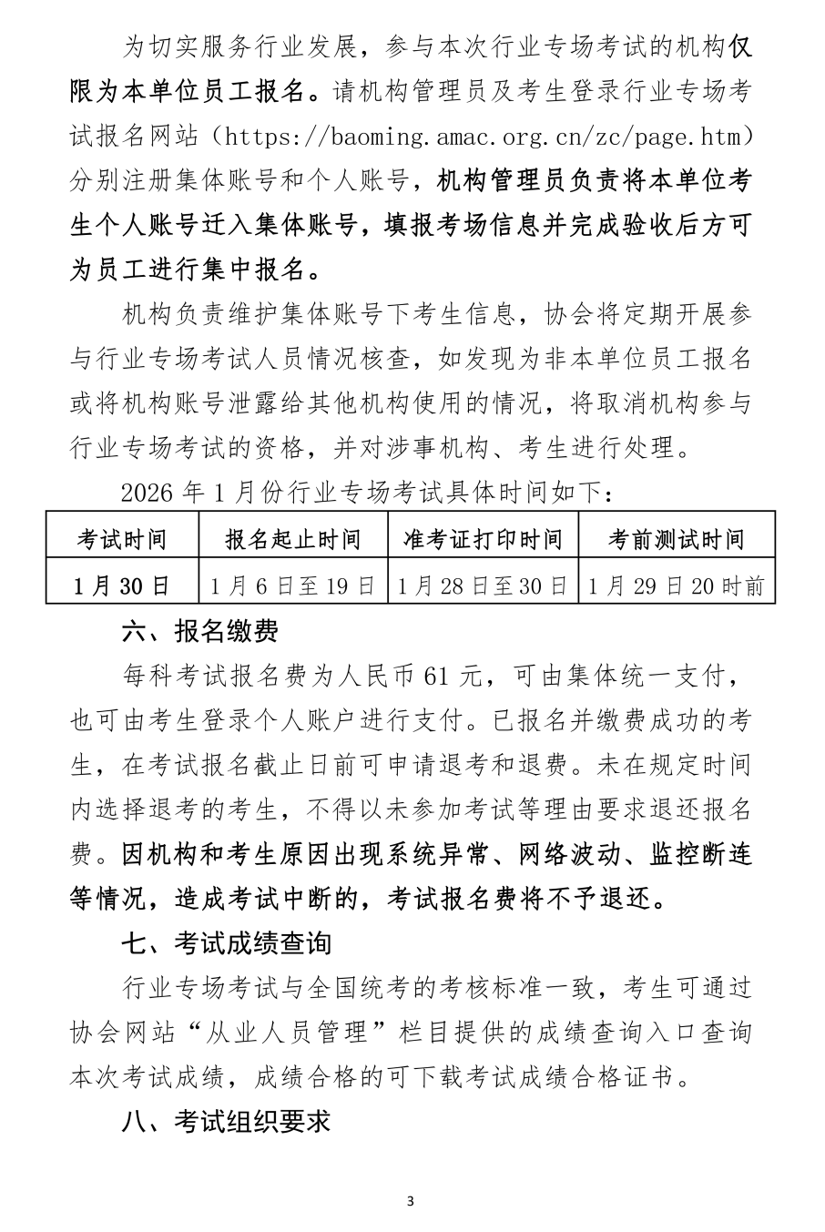 为切实服务行业发展,参与本次行业专场考试的机构仅限为本单位员工报名。请机构管理员及考生登录行业专场考试报名网站(https://baoming.amac.org.cn/zc/page.htm)分别注册集体账号和个人账号,机构管理员负责将本单位考生个人账号迁入集体账号,填报考场信息并完成验收后方可为员工进行集中报名。