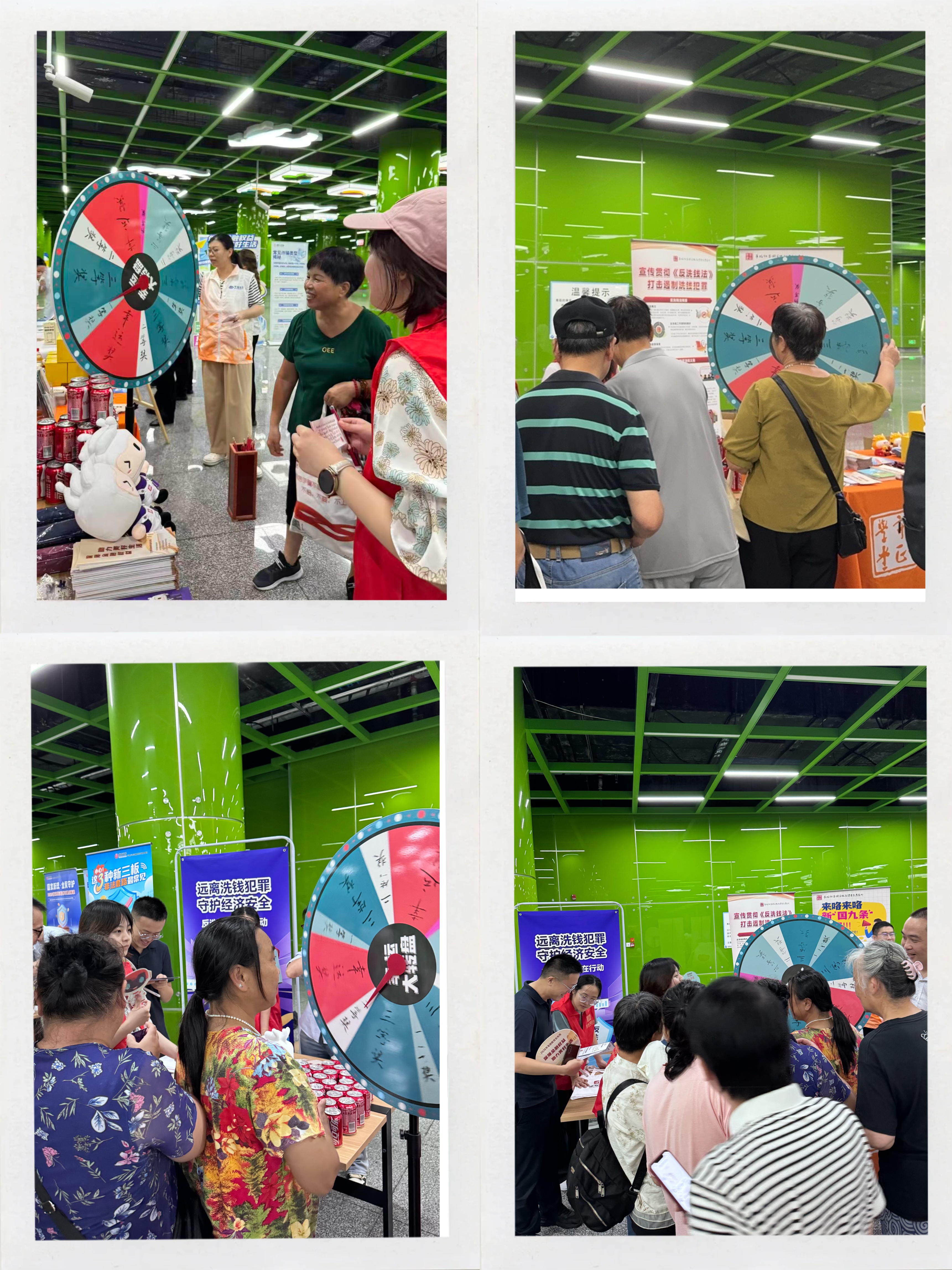 抽奖环节成为活动“吸睛点”,我们定制了“金融知识幸运转盘”,设置雨伞、印有“反洗钱防诈骗”宣传语的定制可乐、帆布包、安仔签字笔、安仔钥匙扣等实用奖品,以“答题赢抽奖机会”为核心,设置50道反洗钱及防非反诈知识题,群众随机抽取题目作答,答对即可获得转盘抽奖资格。问答过程中,工作人员对答错的群众耐心讲解知识点,确保“答错也能学知识”,群众现场参与答题热情高涨。
