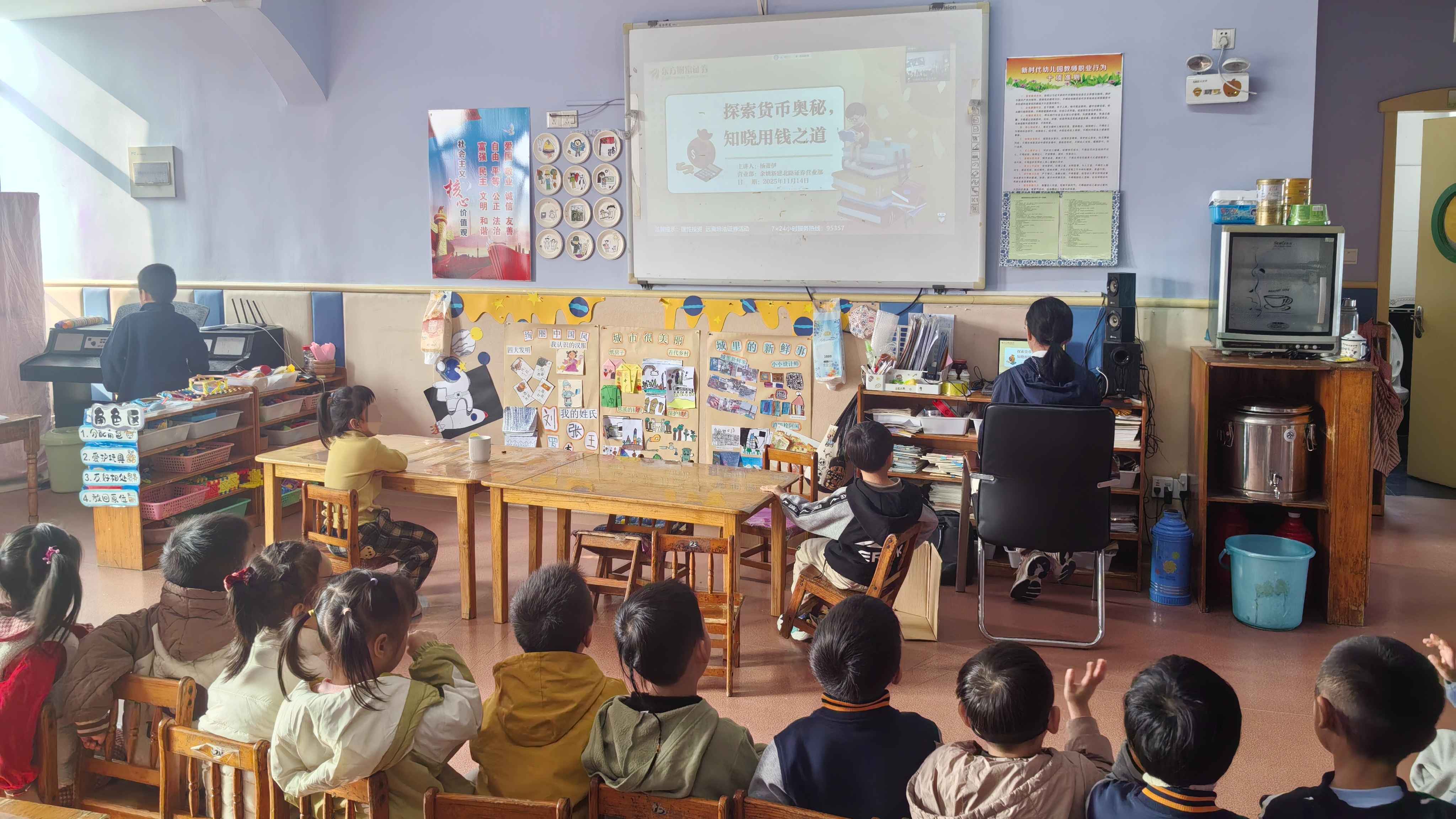 本次活动得到镇西幼儿园的大力支持,并积极组织师生参与。此次讲座由东方财富证券余姚新建北路证券营业部负责人杨萧伊主讲,共有46人参加。本次投教活动旨在从小培养孩子们对金钱的基本认知,树立健康的消费观念,在趣味互动中埋下财商素养的第一粒种子。