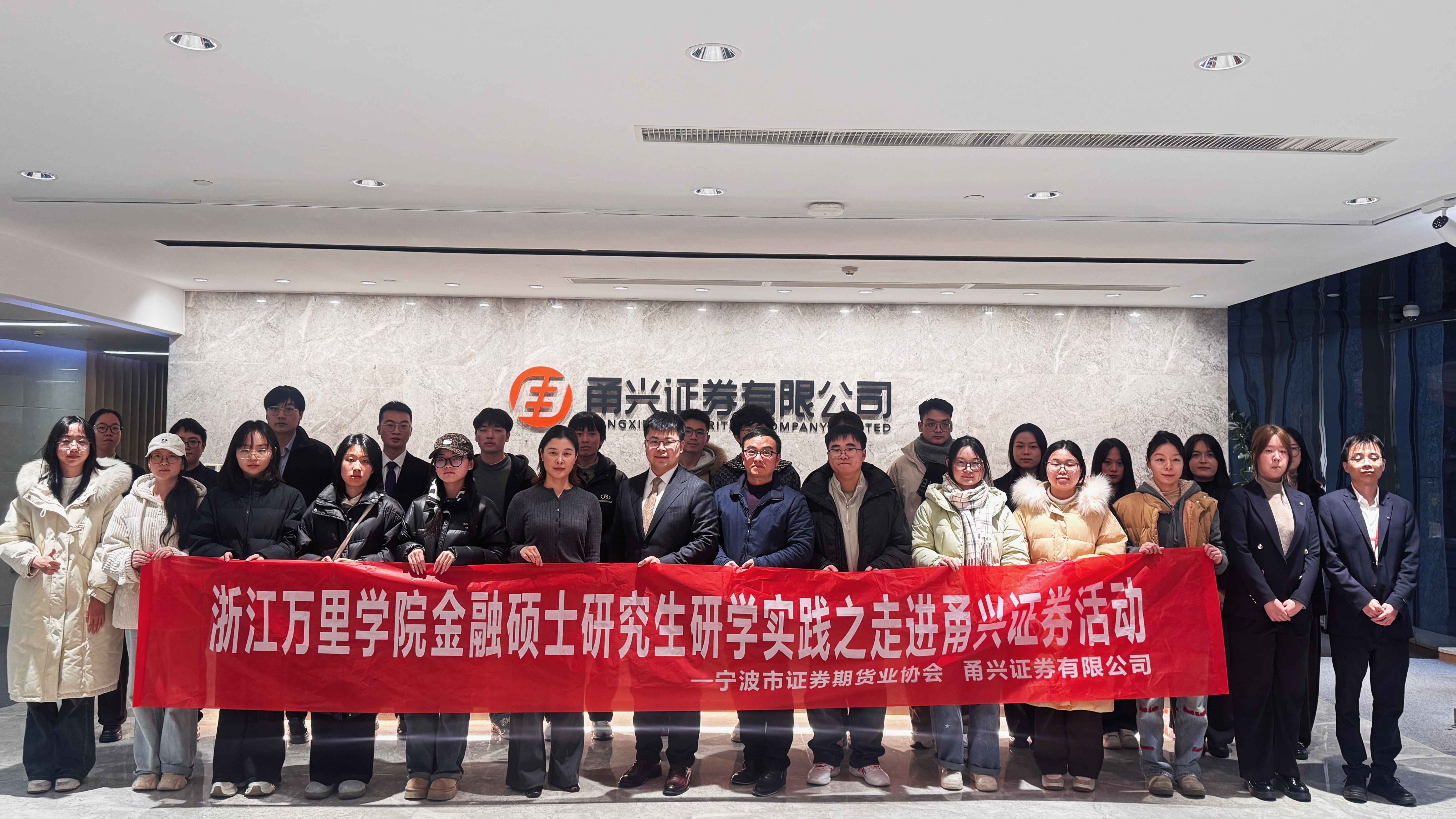 2026年1月30日,在宁波市证券期货业协会的协调支持下,甬兴证券联合浙江万里学院成功举办“金融硕士研究生研学实践之走进甬兴证券”主题活动,活动旨在普及金融知识,为在校学生提供近距离接触行业的机会。浙江万里学院商学院17位师生代表受邀走出校园,走进企业,开展了一场别开生面的研学之旅。