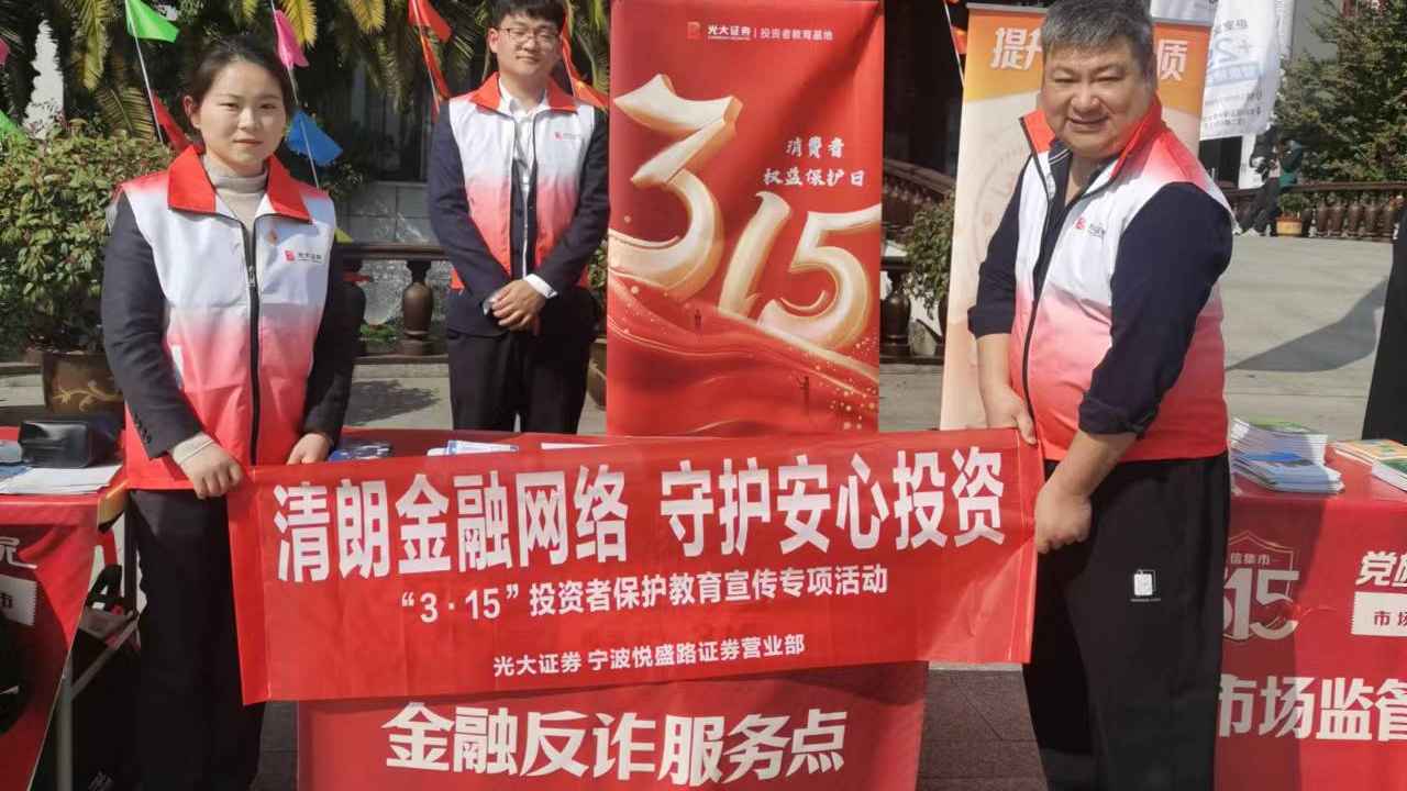为充分发挥党支部战斗堡垒作用,践行“以投资者为本”的初心使命,在“3·15”国际消费者权益日来临之际,2026年3月13日,光大证券宁波悦盛路营业部党支部联合市场社区党委、街道营商办、市场监管所等单位党组织,党员青年志愿者共同参与走进现代商城开展投资者保护专项宣传活动,以党建引领投资者保护工作走深走实。