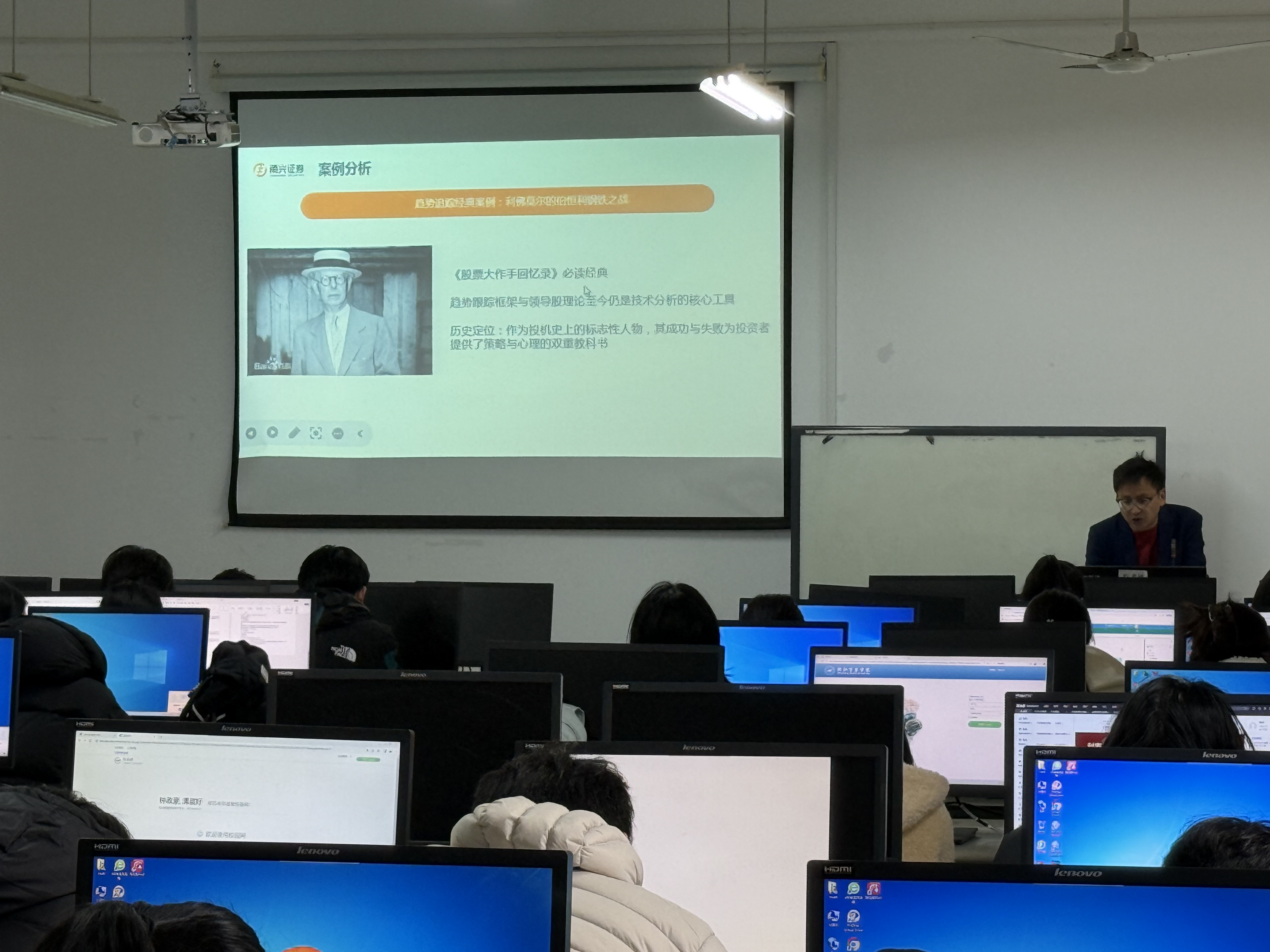 活动伊始,讲师以“你知道的投资大师”为引,围绕股票投资的主要流派与代表人物,启发学生对投资理念的深入思考,系统梳理了基本面派与趋势派的核心逻辑。结合经典案例,深入阐述价值投资的理念基础与实践路径,并通过K线图分析,生动讲解了阻力位、支撑位等关键技术概念,帮助学生初步构建技术分析思维框架。紧跟市场前沿,讲师还介绍了量化投资及HALO策略的基本原理与应用场景,拓展学生对现代投资工具与策略的认知边界。在风险教育环节,重点强调投资过程中风险控制的重要性,围绕“分批建仓”等具体操作策略,引导学生树立理性投资、审慎决策的意识,为其未来规范参与投资活动奠定坚实基础。课堂气氛热烈,互动频繁,获得师生一致好评。